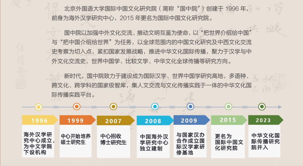 新时代,国中院以服务国家需求为导向,坚持走“内涵、会通、特色”的发展之路,向全球传播中华优秀文化;以世界眼光考察域外中国研究,构建中国自主知识体系和以中国文化为本位的话语体系;探究中华文化全球传播的轨迹和路径,推动文明交流互鉴、助力构建人类命运共同体;推进海外汉学和中国学研究人才培养与平台建设,打造集学术研究、人才培养、咨政服务为一体的特色鲜明的世界一流研究基地。