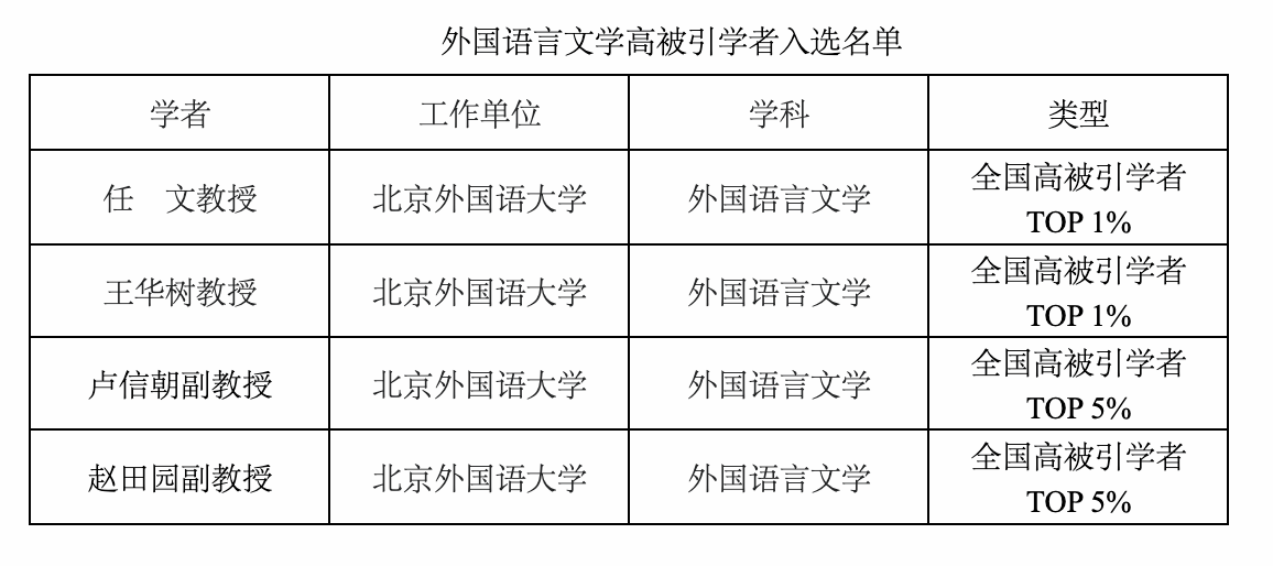 近日,中国知网下属的中国科学文献计量评价研究中心(出版智库)正式公布“2025全国高被引学者”名单。我院四位教师凭借扎实的学术积累和持续的研究产出荣登榜单。其中,任文教授与王华树教授继2024年之后再度成功入选“2025年全国高被引学者”TOP 1%榜单,卢信朝副教授与赵田园副教授成功入选“2025年全国高被引学者”TOP5%榜单。四位教师的集体入选,展示了我院在外国语言文学研究领域形成的学术梯队优势和整体科研实力。