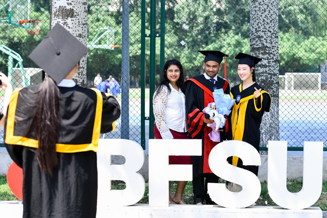 马来西亚驻华大使拿督诺曼·穆罕默德,北外法学院2008级校友、北京霸蛮天下科技有限公司CEO、霸蛮品牌创始人张天一,北外党委书记王定华,党委副书记、校长贾文键,党委常委、副校长贾德忠,党委常委、副校长孙有中,党委副书记、纪委书记胡志钢,党委常委、副校长丁浩、赵刚出席毕业典礼。毕业典礼由贾德忠主持。