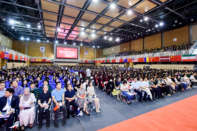 贾文键以“成就大我,拥抱世界”为题致辞,对2024届毕业生圆满完成学业表示祝贺,向辛勤付出的老师、教职员工表示感谢,向一直以来关心支持学生成长的各级领导、各界校友、各方朋友以及家长们致以敬意。