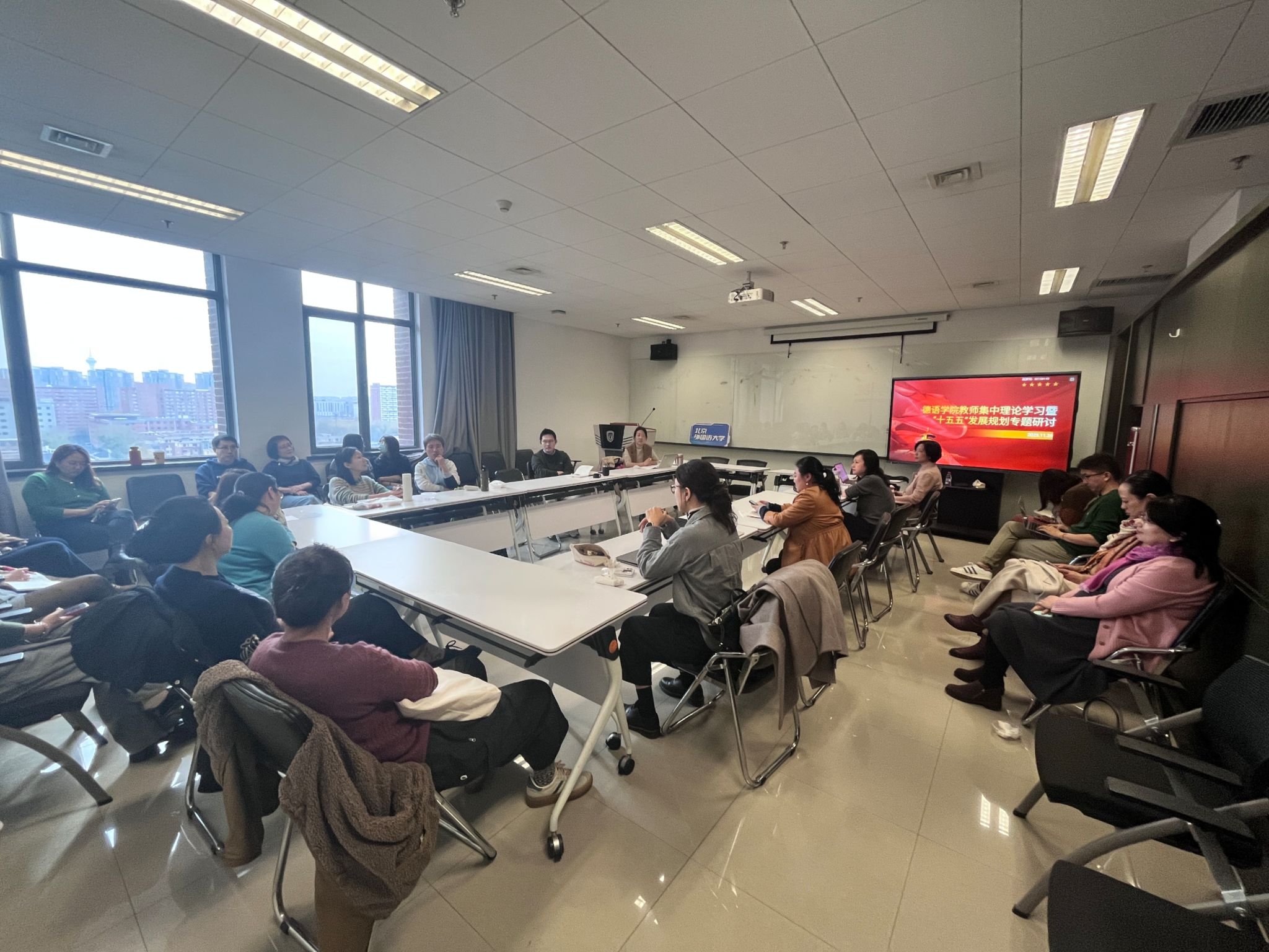 为深入学习贯彻习近平新时代中国特色社会主义思想,精准把握教育强国发展方向,德语学院教师党支部经报德语学院党总支批准,于2025年11月26日下午组织学院教师开展集中理论学习暨学院“十五五”发展规划专题座谈会。会议由德语学院教师党支部书记于芳主持,全院教师积极参与学习研讨。