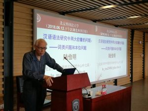2018年6月12日14:30-16:00,应许国璋语言高等研究院和中国外语与教育研究中心邀请,北京大学陆俭明教授在我校图书馆四层会议室做了题为“汉语语法研究中两大胶着问题——词类问题和本位问题”的讲座。此次学术讲堂由北外校长助理、中国外语与教育研究中心主任、国家语言能力发展研究中心主任、许国璋语言高等研究院副院长王文斌教授主持,中国外语与教育研究中心副主任、国家语言能力发展研究中心副主任、许国璋语言高等研究院院长助理何伟教授,以及校内外七八十位教师、硕博研究生、访问学者听取了此次讲座。