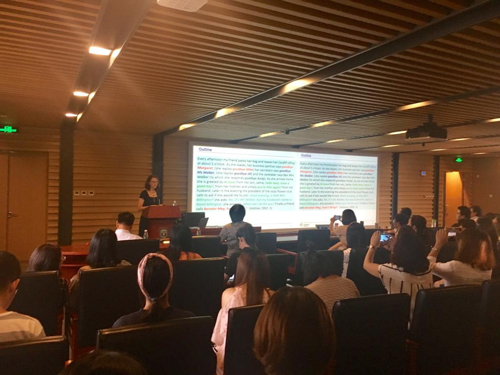 Miriam Locher教授的讲座以“Holmes”书中的语篇以及工作场景、家庭场景与电话场景中的对话开场,分析了不同场景下不同人际关系的用语,从“relation”的角度对语言的使用进行研究。Locher教授的讲座主要分为四个方面:其一,梳理了关于“(im)politeness”话语研究的发展情况以及关于“relational work”的相关研究;其二,提出了“interpersonal pragmatics”;其三,介绍了研究的理论方法和跨学科性;其四,举例并总结了不同语境下对人际关系话语的解读。最后,Locher指出,话语分析可以从不同的视角进行。