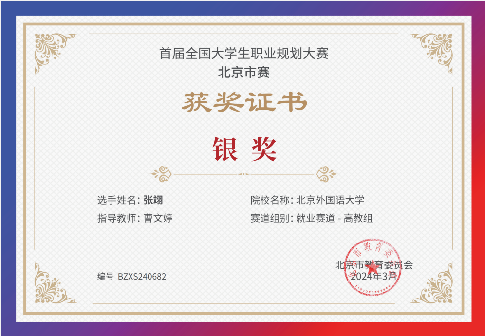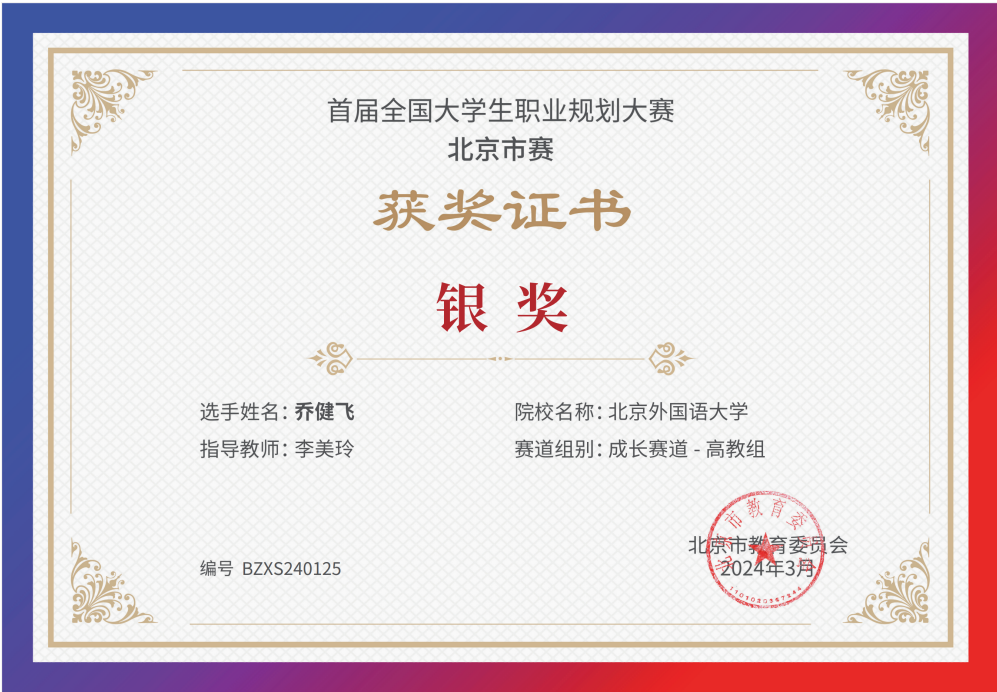 为贯彻落实党中央、国务院关于高校毕业生就业工作的决策部署,加强高校生涯教育和就业指导,促进高校毕业生高质量充分就业,教育部举办首届“筑梦志在四方·规划启航职引未来”全国大学生职业规划大赛。我院同学积极响应、踊跃参与,并在校内选拔赛中脱颖而出,晋级北京市赛。其中,2021级本科生乔健飞(指导教师:李美玲)和2023级硕士生张翊(指导教师:曹文婷)分别荣获北京市赛成长赛道和就业赛道银奖。