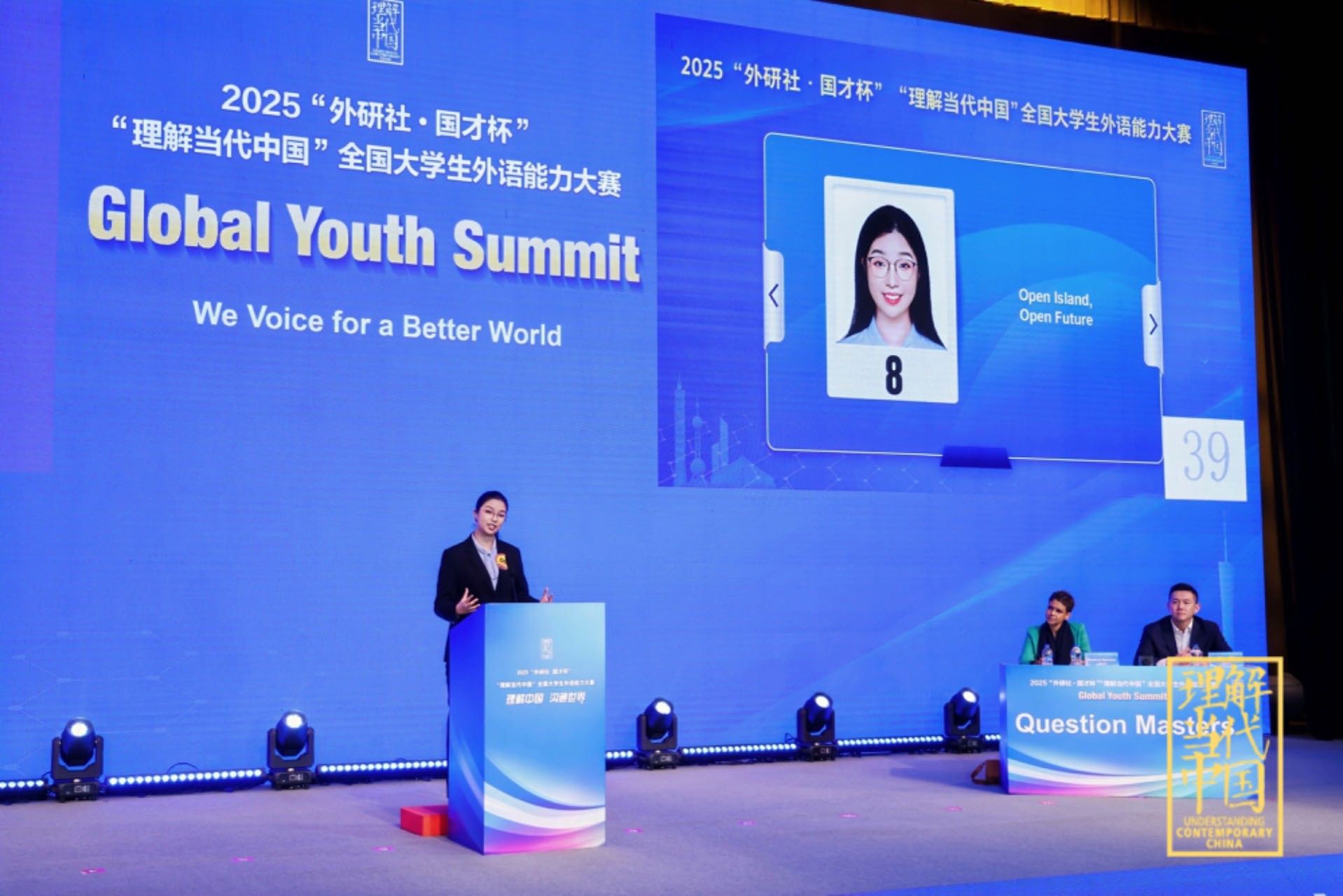 英语学院2023级(国别与区域研究)本科生陈惜缘,在周杜娟老师的指导下,历经前三个阶段的激烈角逐,从60名金奖选手中脱颖而出,成功跻身第四阶段全国前9强的冠亚季争夺赛。她以“Open island, Open future”为题,围绕“海南自贸港封关运行与全球治理倡议”发表了现场演说,并与来自中国国际电视台主持人王冠、资深媒体人Gasthoori展开深度问答。陈惜缘凭借淋漓地道的语言表达、前瞻开阔的思想交锋和自信睿智的台风展示,最终喜获全国季军。
