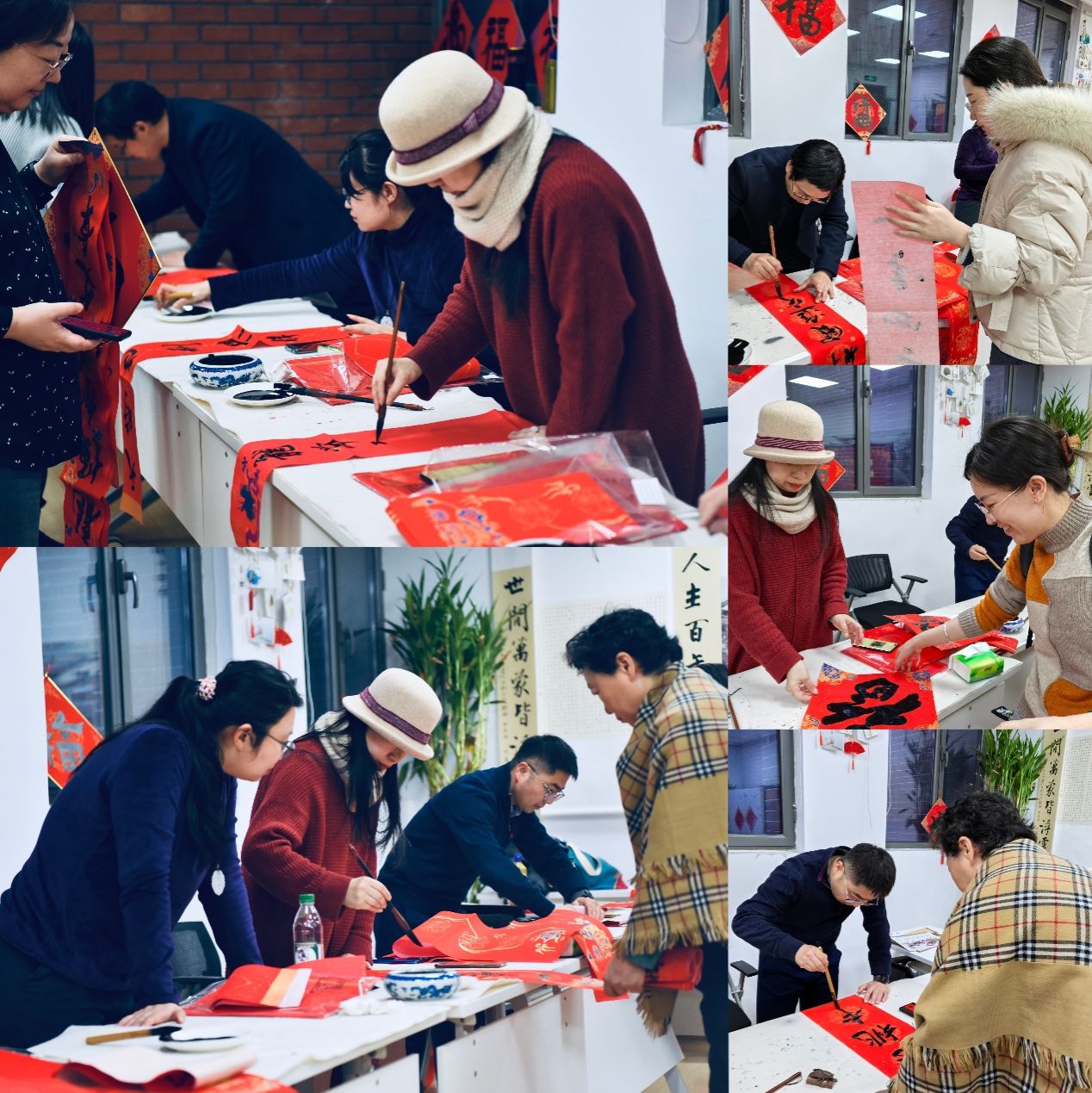 在许森林老师的精彩讲解之后,书写春联活动正式开始。海淀书法家协会的嘉宾和教职工书法协会的老师们挥毫泼墨,现场为教职工书写春联。一幅幅寓意吉祥的春联在笔下诞生,寄托着对新一年的美好祝愿。