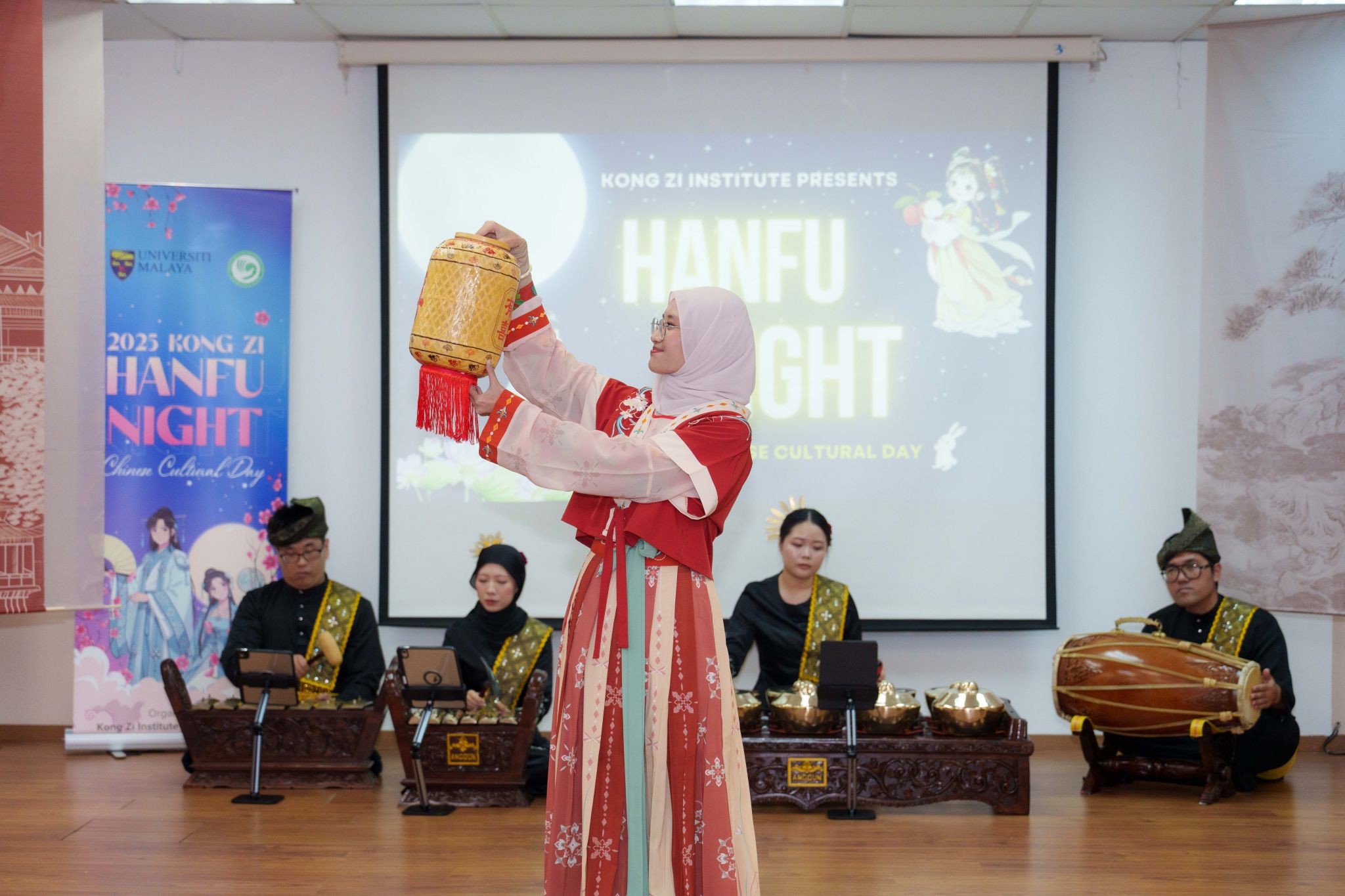 当晚的“月下汉风汉服之夜”将活动推向高潮。在中马特色节目开场后,由孔院学生带来的汉服走秀成为最大亮点。传统服饰与现代舞台艺术的结合,生动展现了中华服饰文化的典雅与韵味,赢得了现场观众的热烈反响。这一环节不仅是一场视觉盛宴,更是一次成功的文化自信展示。