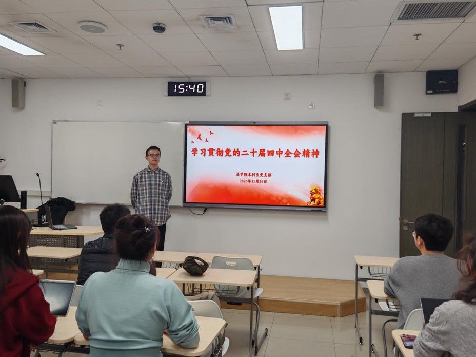 近日,法学院各学生党支部在国际大厦302、306教室与国内大厦703模拟法庭分别召开二十届四中全会专题党课学习会暨党员发展大会,会议由各支部书记主持。