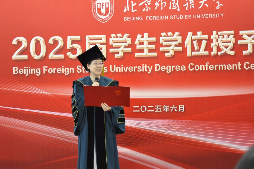 高金萍院长发表致辞,她深情回顾了毕业生们在院期间的学习历程。无论是对古代经典与现代思潮的深入钻研,还是在文学艺术与历史研究领域的探索,毕业生们始终以饱满的热情投入学术。过去在北外的时光里,毕业生们积极与世界各国友人交流互动,为中外文化交流搭建了桥梁。“晨读姐姐”与“暮思哥哥”的意象化表述,生动勾勒了学子们的奋进足迹,彰显了研究院对人才培养的精细化关注。