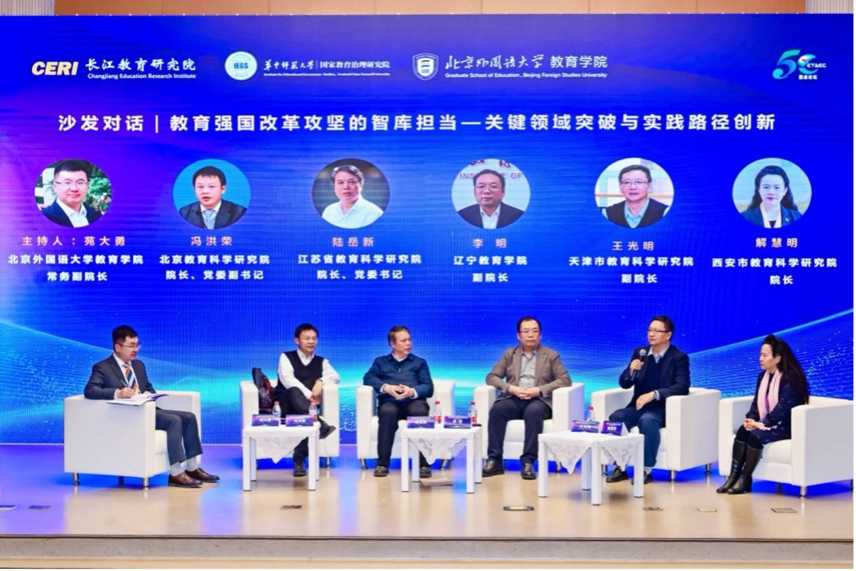 在沙发对话环节,北京教育科学研究院院长冯洪荣、江苏省教育科学研究院院长陆岳新、辽宁教育学院副院长李明、天津教育科学研究院副院长王光明、西安市教育科学研究院院长解慧明围绕“教育强国改革攻坚中的智库担当”这一主题展开深入交流。各位院长分享了各自机构在服务教育决策、引领教育实践方面的创新做法和宝贵经验,并就“十五五”期间教育科研工作的重点方向和推进策略达成了重要共识。大家一致认为,教育科研机构应进一步强化有组织科研,深化数字技术赋能,加强跨学科协同和跨地域合作,为推动教育强国建设提供更加有力的智力支持。
