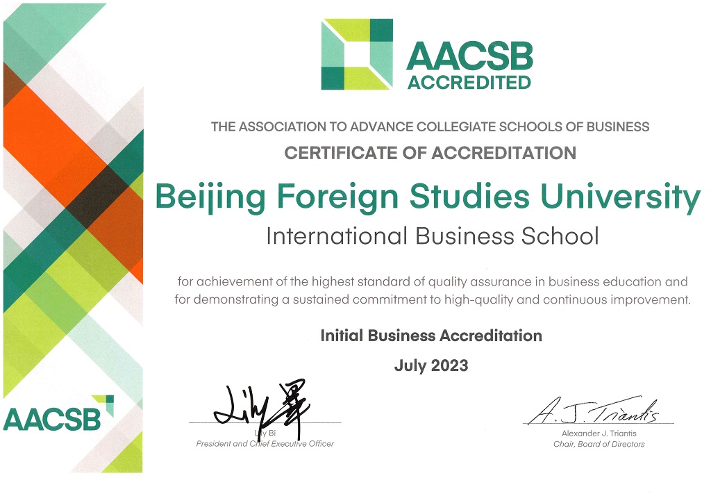 获得AACSB认证是我校国际商学院发展的重要里程碑。AACSB认证是国际公认的历史最为悠久、认证标准最为严格、含金量最高的商学院教育认证,获得该认证标志着学院商学教育达到世界一流水平,对于学院的品牌建设、办学水平、国际影响力、业务拓展等方面都具有重大意义。未来,国际商学院将在“融合多元文化、激发持续创新,培养具有开放视野、社会责任和全球胜任力的未来商业精英”的使命指引下,在学科建设、师资管理、人才培养等方面持续发展,打造具有“语言、科技、绿色、全球”特点的卓越商学院。