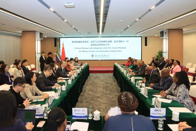 贾文键对代表团一行来访表示热烈欢迎,他介绍了北外在语言教育、区域国别研究、人文交往等方面的历史传统与突出成绩,尤其是在助力中南高级别人文交流机制发展上所作出的不懈努力。贾文键强调,北外始终将南非视为重要合作伙伴。期待以此次会谈为契机,进一步拓展北外与南非各界在人员交流、联合研究、经典互译、艺术合作等领域的创新合作,助力构建更加立体、多元的中南人文交流新格局,为全球南方国家文明互鉴树立典范。