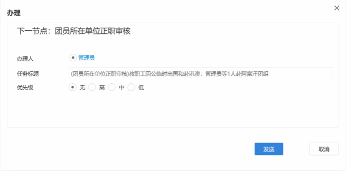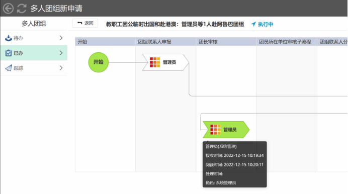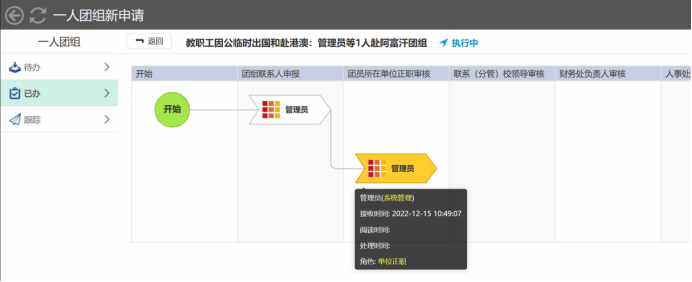 第四步:一人团组提交后,下一步会发送所在单位领导审核环节,系统自动显示下一环节办理人。可通过“已办任务”查看团组当前进度,确认提交状态: