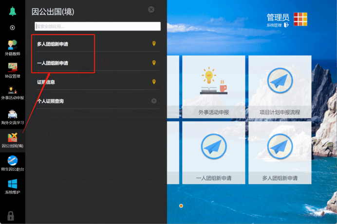 第一步:在左侧导航栏中,依次点击【因公出国(境)】->【多人团组新申请】,如图所示: