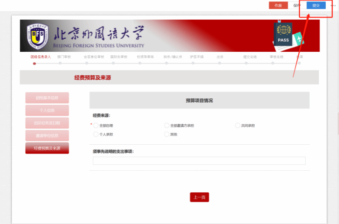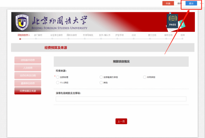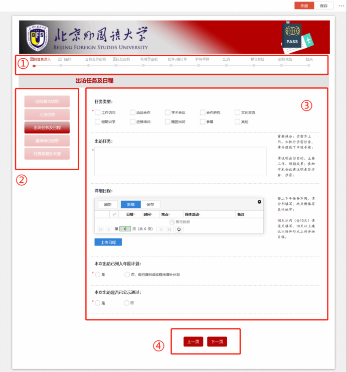 功能操作:一人团组申报可由团长填报,同时提交团组出访信息及本人基本信息,团组审批通过及其他相关手续完成后方可执行。