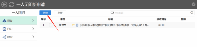 第一步:在左侧导航栏中,依次点击【因公出国(境)】->【一人团组新申请】,如图所示: