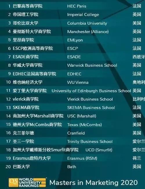美国和英国再次显示了其在市场营销硕士专业方面的卓越成就,在市场营销硕士排名中,英美学校占据了77所学校中的42所。