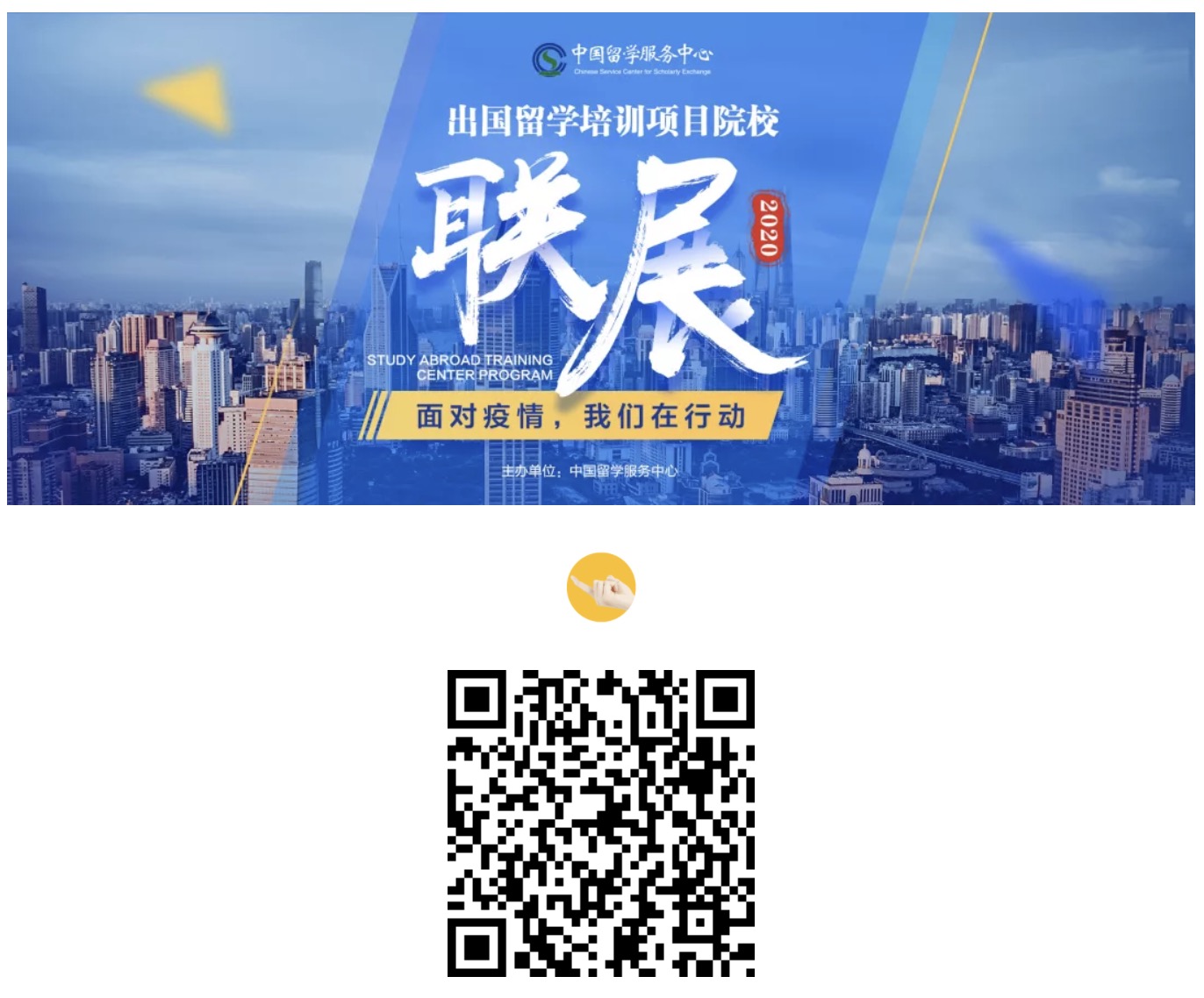 中国(教育部)留学服务中心联合近50所国内高校在新浪网教育频道推出“出国留学培训项目院校联展”。本次联展分两期展示,第一期于2020年6月28日-7月4日在新浪网教育频道各条新闻中以画中画形式展出,并于2020年6月28-7月2日在教育频道高考栏目“全国高校招生会2020网络咨询会”页面以顶部通栏形式呈现。第二期将于7月19-25日在新浪网教育频道高考栏目以焦点图形式上线。更多详情,请扫描下方二维码查看: