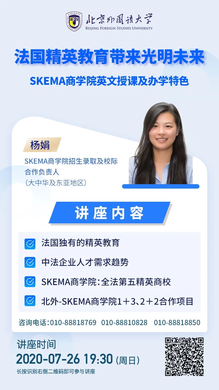 本周日7月26日晚19:30,法国SKEMA商学院 招生录取及校际合作负责人(大中华及东亚地区)杨娟老师将进行在线讲座。