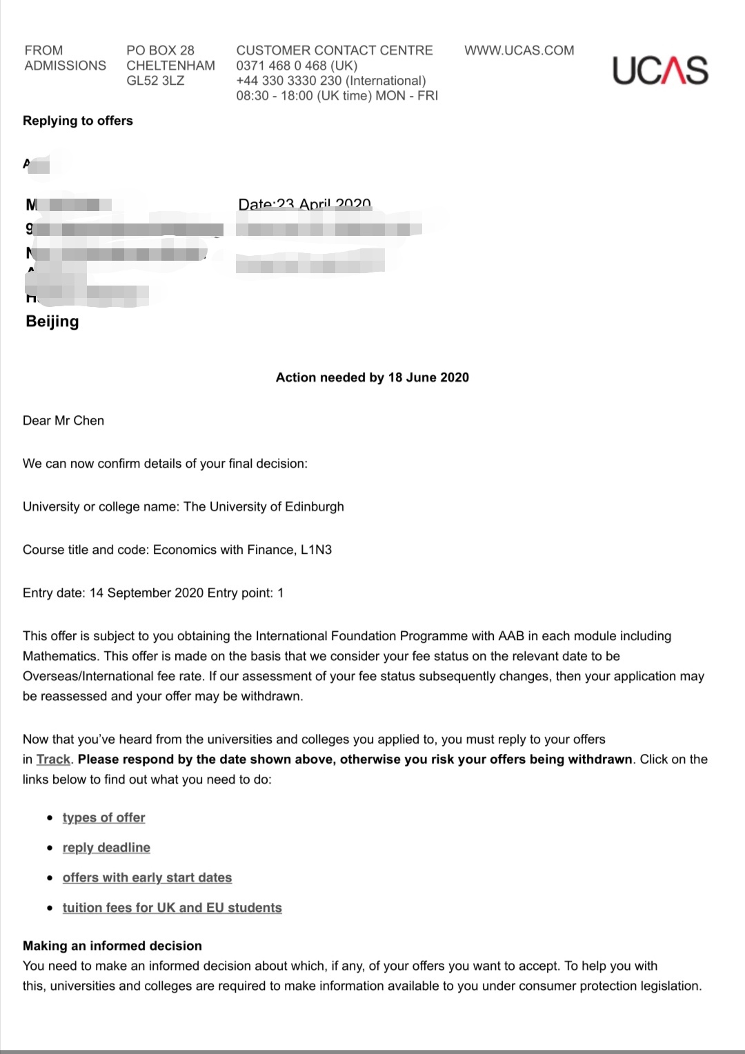 雷竞技官网(rayban)国际商学院经济管理国际项目19级陈同学,成功被爱丁堡大学Economics with Finance专业录取!