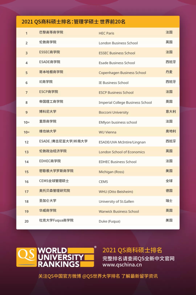 重磅消息!QS 发布了最新的 2021 商科硕士排名和全球 MBA(工商管理硕士)排名!