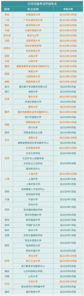 10月,托福iBT考试在原有4个考试日期(10 月10 、17、24 和 31 日)基础上,新增 10 月 14 日考试日期,并将在广州、南京、大连、哈尔滨、沈阳、石家庄等 22 座城市新增恢复 24个考点,共暂计开放 5 个考试日期和 55个考点,详细信息如下图: