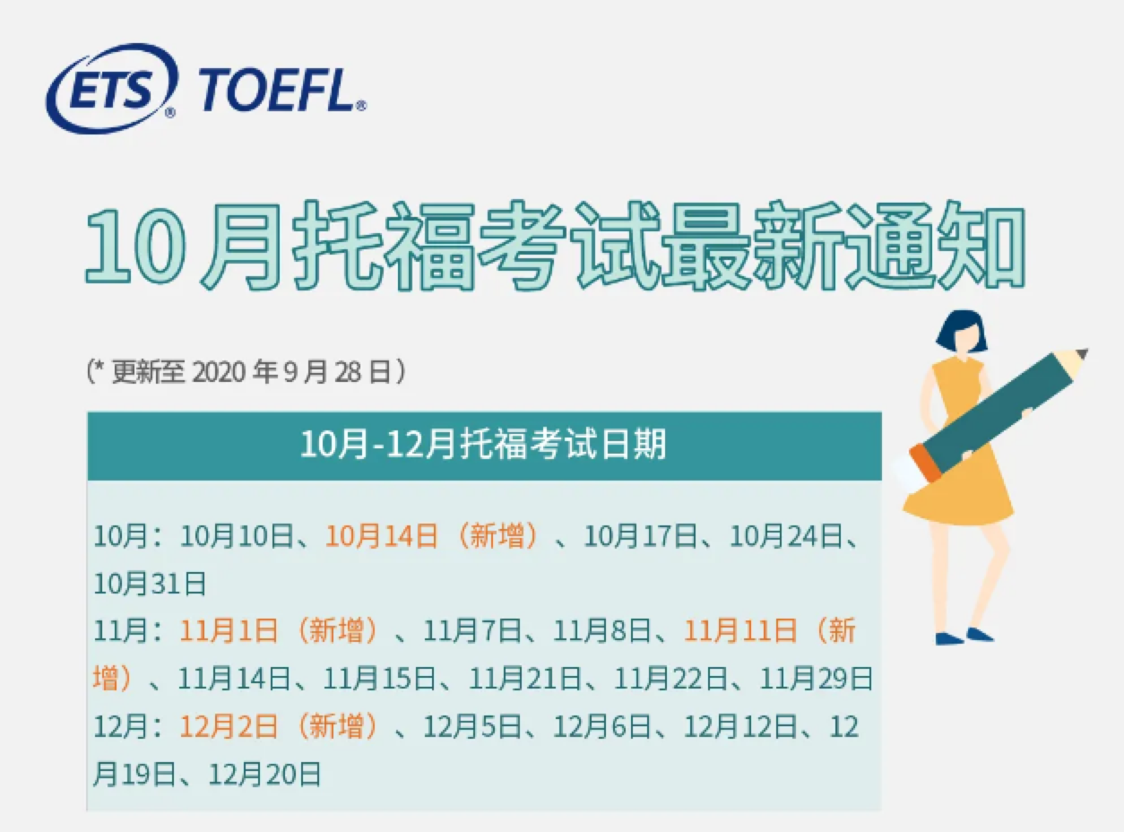 同时,11 月至 12 月,托福iBT考试将在原有 12 个考试日期基础上,新增 3 个考试日期,分别为 11 月 1 日、11 月 11 日、12 月 2 日。