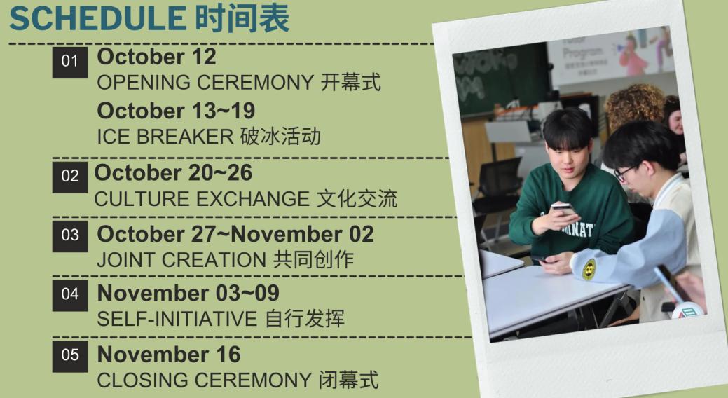 整个活动为期五周,在此期间,参与者将以小组组合的形式参与各项活动。这种小组形式对于促进学生之间的紧密协作以及互动交流具有积极作用,能够使学生更好地融入活动,进而共同完成各项任务。