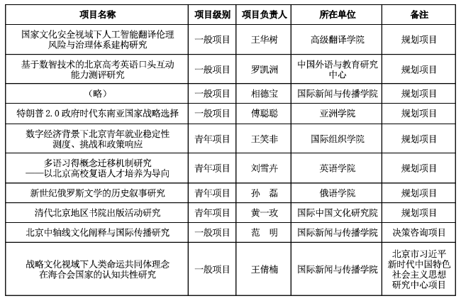 从级别来看,本年度入选项目包括一般项目6项、青年项目4项。从类别来看,有8项规划项目、1项决策咨询项目、1项北京市习近平新时代中国特色社会主义思想研究中心项目。从内容来看,这些项目主要聚焦于外国语言文学、新闻传播学、区域国别学、社会学等学科的前沿学术问题。该成绩充分反映了北外在人文社科领域的深厚积淀与创新能力。学校将持续支持各项目团队扎实推进研究工作,努力产出高质量成果。