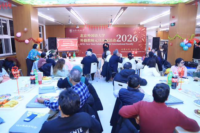 赵刚向辛勤工作在教学科研一线的全体外籍教师及其家属致以诚挚的新年问候和由衷感谢,回顾了北外一年来在教学科研与国际交流等方面取得的成绩。他表示,外籍教师们为北外国际化人才培养、学科建设和国际交流合作作出了积极贡献。他们不仅是知识文化的传播者,更是构建中外民心相通的重要桥梁。希望全体外籍教师继续投身北外“十五五”建设,深入学习和传承“伊莎白精神”,担当起中外文明交流互鉴的使者,不仅将世界各地的先进知识和多元文化引入北外,更将博大精深的中华文化、真实立体的中国形象传递给世界,为构建人类命运共同体贡献北外力量。