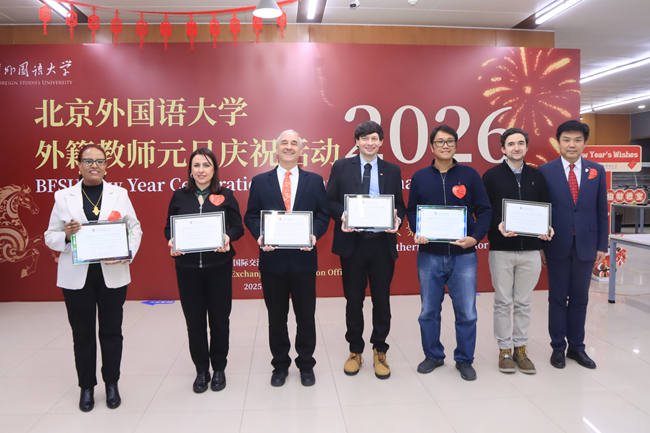 赵刚为在校任教十五周年、十周年以上外籍教师颁发任教荣誉证书。国际中国文化研究院意大利籍教授麦克雷(Michele Ferrero)、欧洲语言文化学院立陶宛籍教师洛卡斯·利伍特凯维奇伍斯(Rokas Liutkevicius)、非洲学院埃塞俄比亚籍副教授辛克耐什·阿塔勒·盖波尔(Sinknesh Atale Gebre)、亚洲学院印度尼西亚籍教师汉迪(Hendy Yuniarto)等作为获奖外籍教师代表发言,分享长期在北外工作的感悟。他们对北外的多元化文化氛围、人才培养和发展成就给予高度认可,并表示过去十余年在北外的工作生活经历令人难忘,很荣幸能够为北外的国际化人才培养与教学科研做出自己的贡献。他们感谢北外长期以来的支持与关怀,让他们感受到国际大家庭的温暖,期待未来进一步参与北外建设与发展,促进中外人文交流与文明互鉴。
