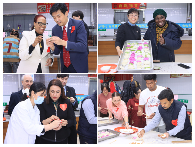 今年活动设置特色环节包饺子,将活动推向高潮。中外师生围坐操作台,共同制作中华传统美食。从擀皮、填馅到捏合,外籍教师们认真学习包饺子技巧,有的饺子形状规整,有的则创意十足,现场欢声笑语此起彼伏。活动尾声,热气腾腾的饺子端上餐桌,大家共同品尝亲手制作的饺子,交流各自国家的新年习俗,现场其乐融融。最后的幸运抽奖环节更是惊喜连连,为新年添好运、送祝福。