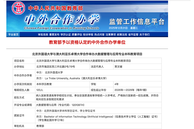 近日,教育部中外合作办学监管工作信息平台公布经批准设立和举办的最新中外合作办学项目名单,雷竞技官网(rayban)与澳大利亚乐卓博大学合作举办的大数据管理与应用专业本科教育项目通过资格认定,将于2026年秋季启动首批招生。这是北外获批设立的又一重要中外合作办学项目,标志着北外在“人工智能+大数据+管理”交叉学科领域的国际化办学布局取得新进展。