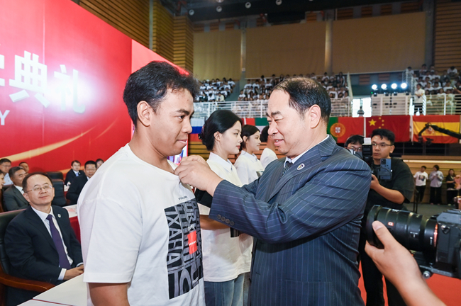 王定华为新生代表们佩戴校徽,并颁发校园卡。在场的全体新生一同佩戴校徽,正式成为“北外人”,肩负起“语通中外、道济天下”的北外使命和“人民需要我们到哪里,我们就到哪里”的责任担当。
