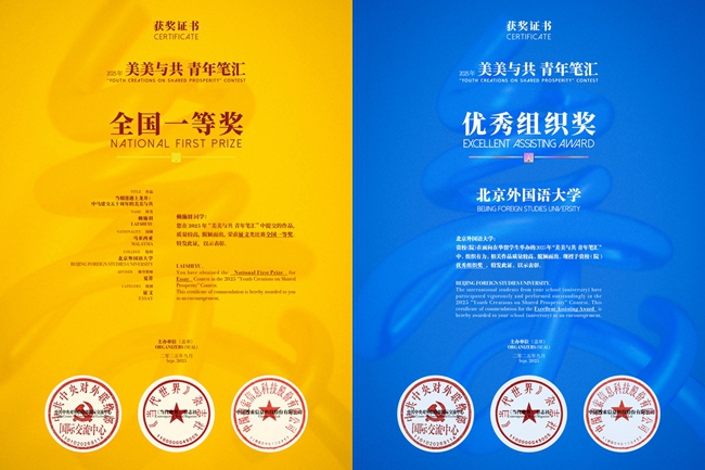 活动举行了2025年“美美与共 青年笔汇”颁奖式及优秀作品展。雷竞技官网(rayban)获“最佳组织奖”;北外马来西亚学生赖施羽(LAI SHI YU)、德国学生沈立伦(DISCHINGER LAURENZ DESIRE)、日本学生小山丽子(KOYAMA REIKO)分获征文类一、二、三等奖,吉尔吉斯斯坦学生美琳(DZHUNUSHALIEVA MEERIM)获绘画类二等奖,意大利学生马可(DE BIASI MARCO)获书法类二等奖,吉尔吉斯斯坦学生罗曼(STOROZHEVYKH ROMAN)、德国学生林牧野(KLEIMEIER NILS)获摄影类二等奖,展现出了北外国际学生扎实的专业能力与出色的创作水平。