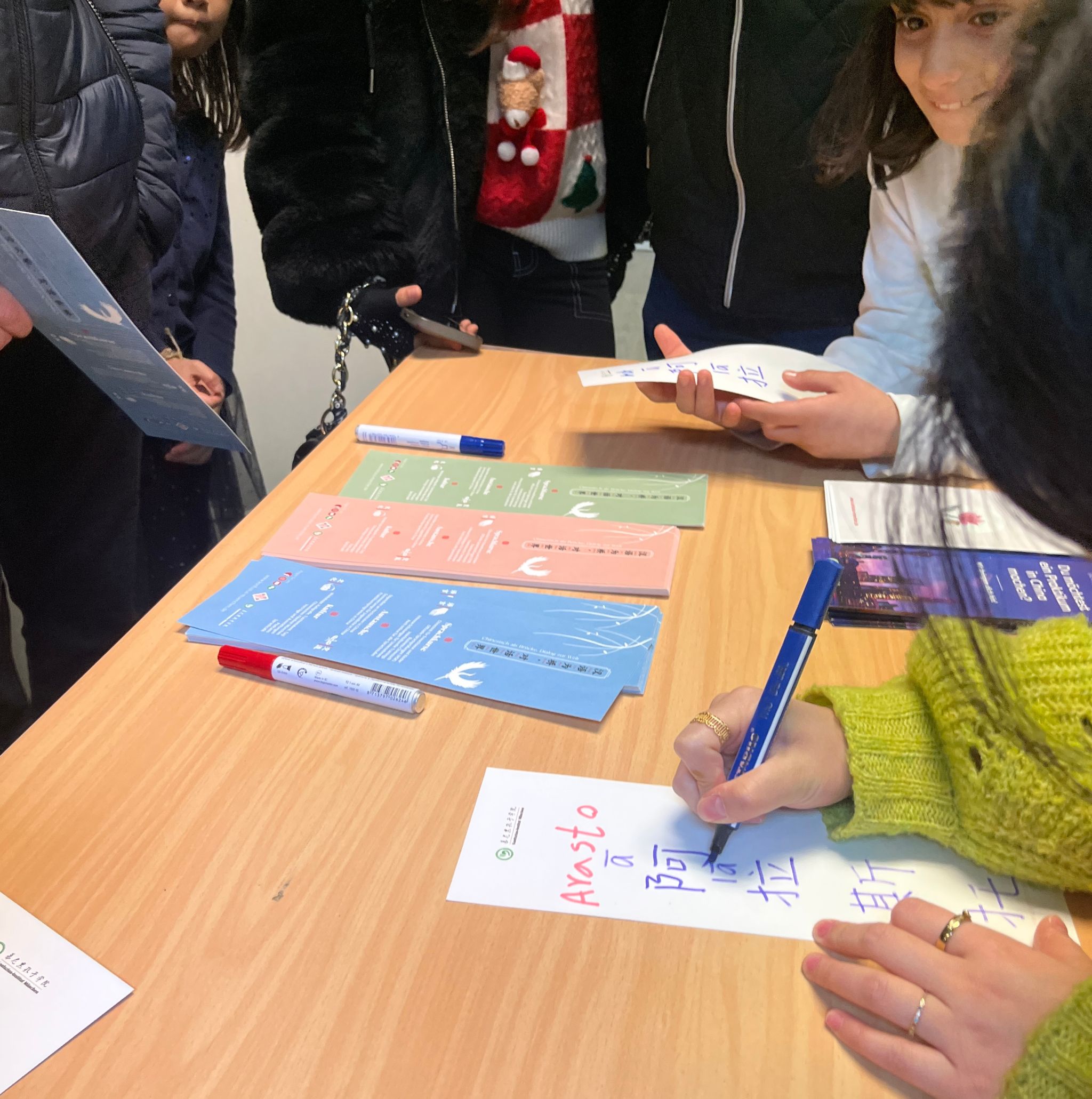 作为主要语言文化代表机构之一,慕尼黑孔子学院携手慕尼黑中文学校志愿者表演者思思,为观众带来了川剧变脸表演和成语故事朗读。中国传统艺术的独特魅力、汉语的语言韵律,以及《马马虎虎》《盲人摸象》等成语中蕴含的深刻智慧,赢得了现场观众的热烈反响。除舞台表演外,慕尼黑孔子学院还特别设置了汉语名字卡牌互动体验区,吸引众多家长与孩子积极参与。参与者不仅获得了个人中文译名,还在现场尝试朗读自己的汉语名字,亲身感受汉字音形之美。