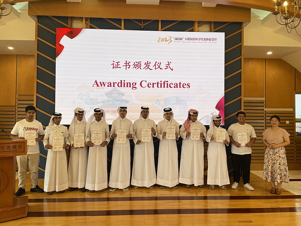 随后,夏令营营员表演了卡塔尔传统舞蹈和中文情景对话。夏令营授课教师为班级学员颁发夏令营结业证书。闭营仪式最后,卡方三位带队教师为营员依次颁发YCT考试证书。本期夏令营所有营员来华后从零起点开始学习中文,在夏令营后期安排的YCT考试中均通过了YCT一级考试,其中9位同学获得满分;另有12位同学通过了YCT二级考试,取得了优异的成绩。