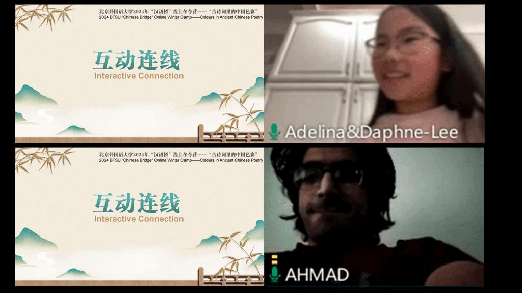 在开营仪式学员连线互动中,来自美国的小学员Adelina Lee和 Daphne Lee表演了古诗《静夜思》的吟诵。来自巴基斯坦的学员AHMAD表示,“虽然现在中文水平不足,还听不太懂中文,但是对中国古诗词非常有兴趣”。