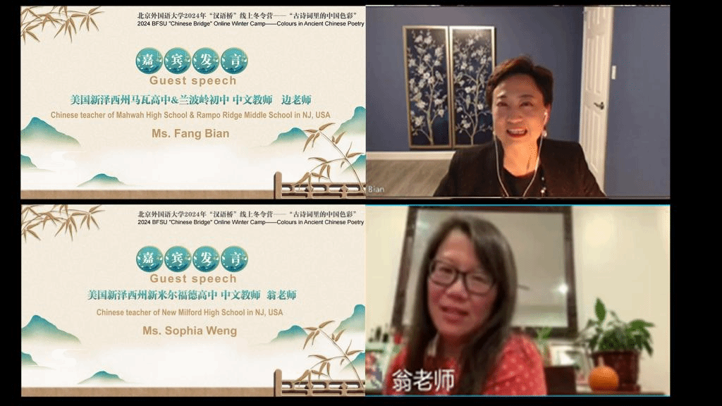 两位海外嘉宾教师——来自美国新泽西州马瓦区的中文教师边老师和来自美国新泽西州新米尔福德区的中文教师翁老师各自分享了她们所在学校的学生情况以及为参加本次线上冬令营所做的各项准备。在美校方支持和两位老师的组织下,本次冬令营直播课将走进上述两所学校的高中中文课堂,与学生们的日常中文课学习实时对接,同时连线参加冬令营的其他国家学员进行互动交流。