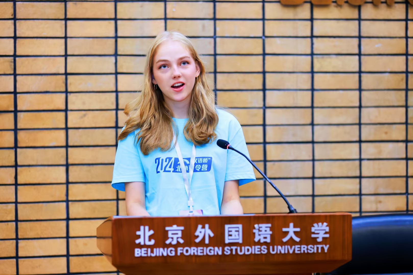 营员代表阿丽娜·诺维科娃(Арина Новикова)今年17岁,已有九年的中文学习经历。她在发言中分享了自己对在全球化背景下如何传承和发扬中国传统文化这一课题的个人见解,并表达了希望投身于中俄两国文化交流事业的愿望。