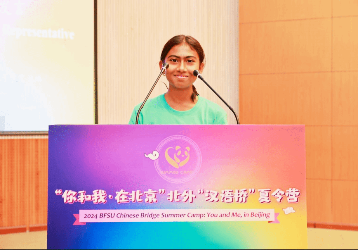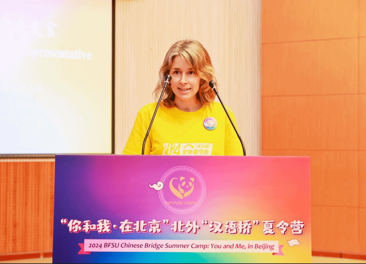 西班牙巴塞罗那孔子学院中文教师殷美林(Mariana Ubach Huelin)和马来西亚马来亚大学孔子学院学员达琳(Darin Athira Binti Mohammed Azzath)分别代表带队教师和营员发言。殷美林讲述了自己与中国和中文的缘分,并对组织项目的各方表达了衷心感谢。她期待与营员们一起在北京这座充满历史和文化底蕴的城市中学习探索,留下美好的回忆。达琳提到,她自幼学习中文,已经连续两年参加了马来亚大学孔子学院举办的“汉语桥”比赛。对中国文化越来越感兴趣的她,今年终于圆梦,来到北京参加向往已久的夏令营。她对即将到来的课程和活动非常期待,渴望用中文与来自世界各地的伙伴们谈梦想、话未来。