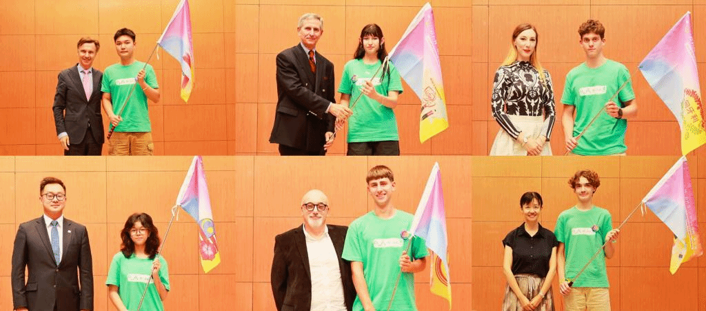 致辞环节结束后,嘉宾们为各国小队代表授旗,并为带队教师赠书。本届夏令营正式拉开序幕。