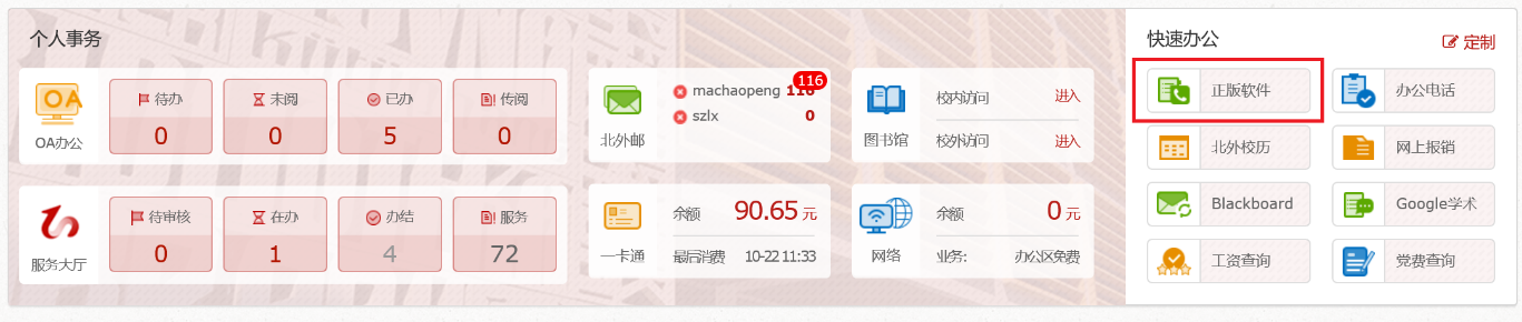 登录数字北外,选择“快速办公”中的“正版软件”(见图13-1)或者直接域名登录i.bfsu.edu.cn/genuine。输入同数字北外用户名和密码。