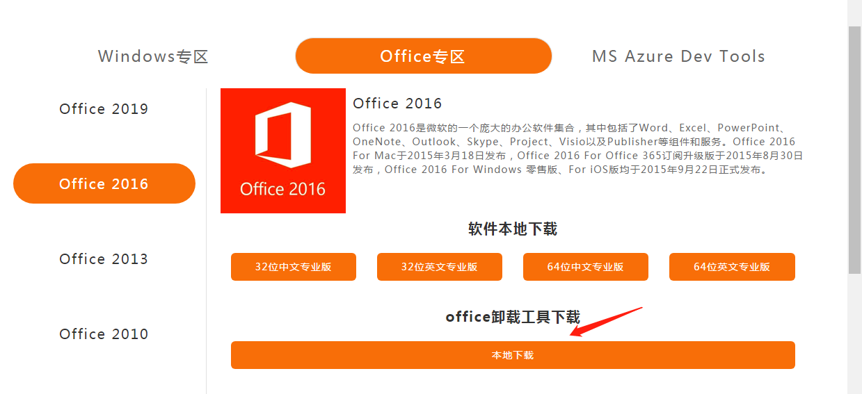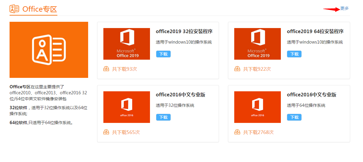 在Office专区(Windows专区)选择适合本机版本的安装软件进行下载。点击右上角“更多”,显示更多版本的安装软件。