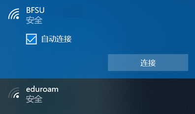 点击桌面右下角的网络图标,在弹出的列表中选“BFSU”,并保持“自动连接”处于勾选状态,然后点击“连接”(见图3-5),