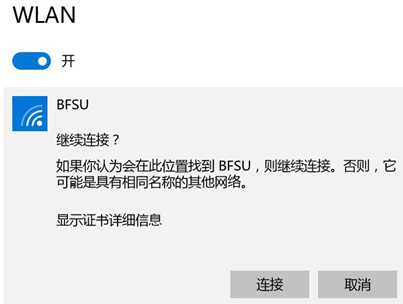 “设置 -> 无线局域网”,选择“BFSU”的无线连接(见图3-1),