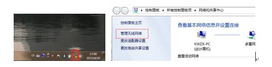 鼠标右键点击网络,选择“打开网络和共享中心”(见图3-10-1),单击“管理无线网络”(见图3-10-2),