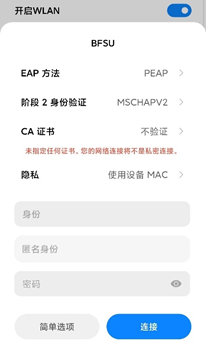 在“设置 ”->“WLAN”下选择“BFSU”。在弹出的界面中,“EAP方法”选择“PEAP”,“阶段2身份验证”选择“mschapv2”,“CA证书”选择默认,“身份”一栏内填入学工号(即上网账号),“匿名身份”选择空白(无需填写),“密码”一栏内填入密码,其他选项保持默认状态,然后点击“连接”,即可以加密方式连入无线网(见图3-4)。在无线开启的状态下,当用户进入无线网覆盖范围内,设备将自动连入网络无需重复操作。