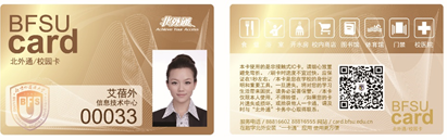 北外校园卡是一种非接触式智能卡,卡表面印刷有部分个人信息,包括工号、姓名、院系部门和照片(普通教工卡见图16-1)。