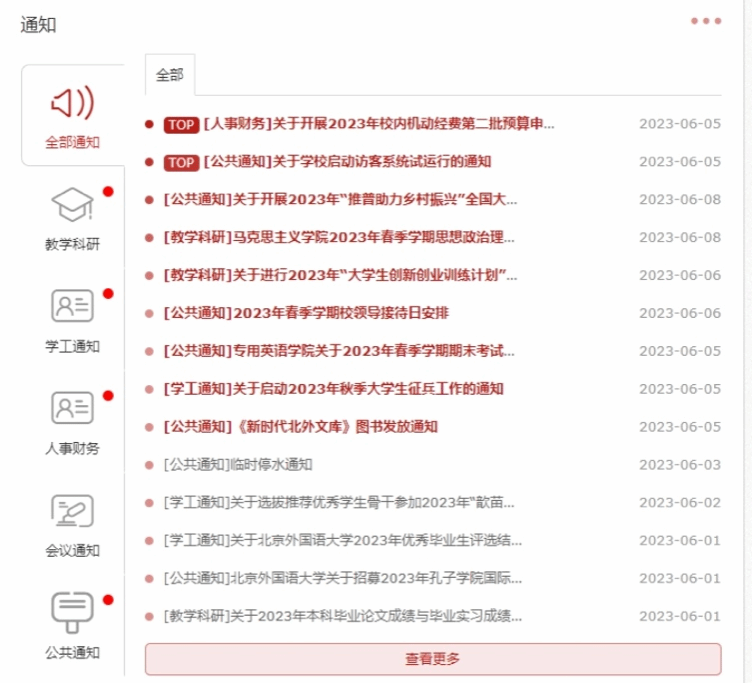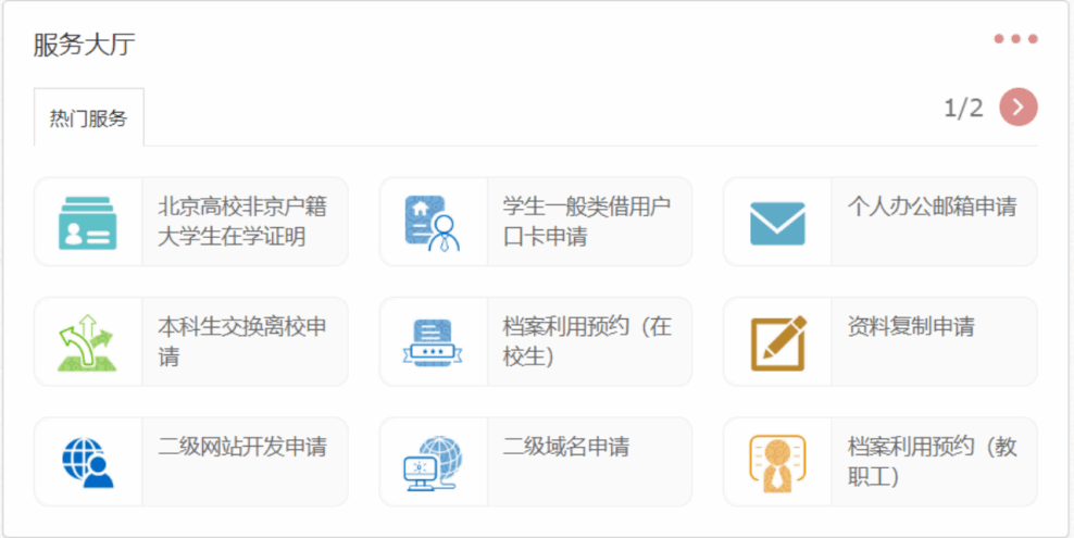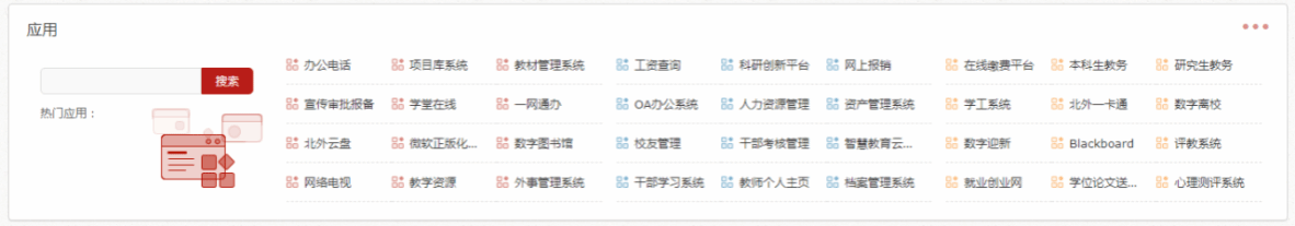 用来显示与师生相关的北外邮箱、一卡通、网费信息等,一网通办可以直接点击进入应用系统办理相应事项。